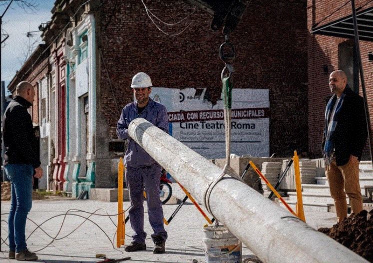 En paralelo, se ejecutaron tareas de renovación del tendido eléctrico sobre la vereda de calle Rivadavia, entre Alem y Avenida Vaccarezza, con la colocación de nuevos postes de hormigón por parte de la empresa EDEN. El objetivo es ordenar el cableado aéreo para mejorar la visibilidad de fachadas históricas como la del Cine Teatro Roma, además de reforzar la seguridad urbana en esa zona.