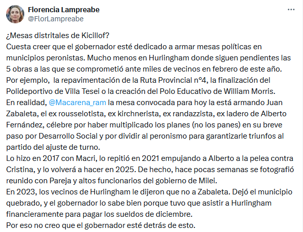 Durante la mañana de este viernes, circuló por las redes sociales una convocatoria a la mesa “En Hurlingham es con Axel”. Rápidamente, allegados al gobernador de la Provincia de Buenos Aires salieron a desmarcarse de una jugada que atribuyeron sin dudar al ex ministro de Alberto Fernández, Juan Zabaleta. “¿Cómo Axel va a lanzar oficialmente una mesa con el tipo que hace dos semanas se sacó una foto con funcionarios de Milei? Axel está en la vereda de enfrente de todo eso”, razonó una fuente con acceso a Dardo Rocha.