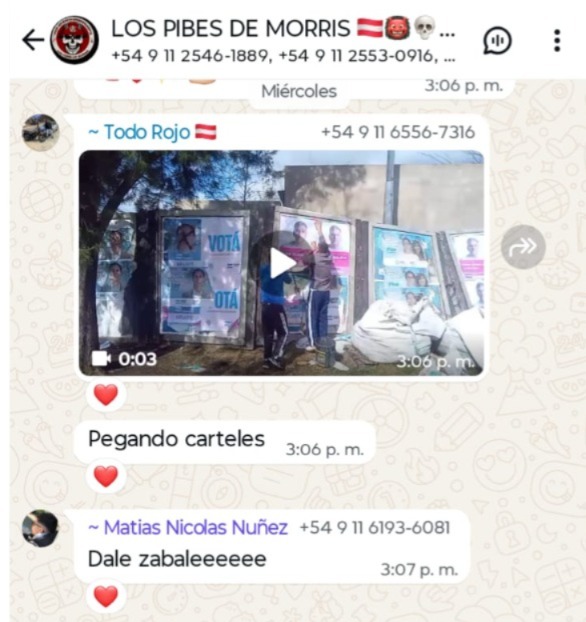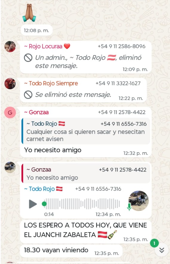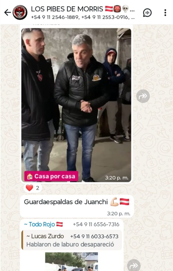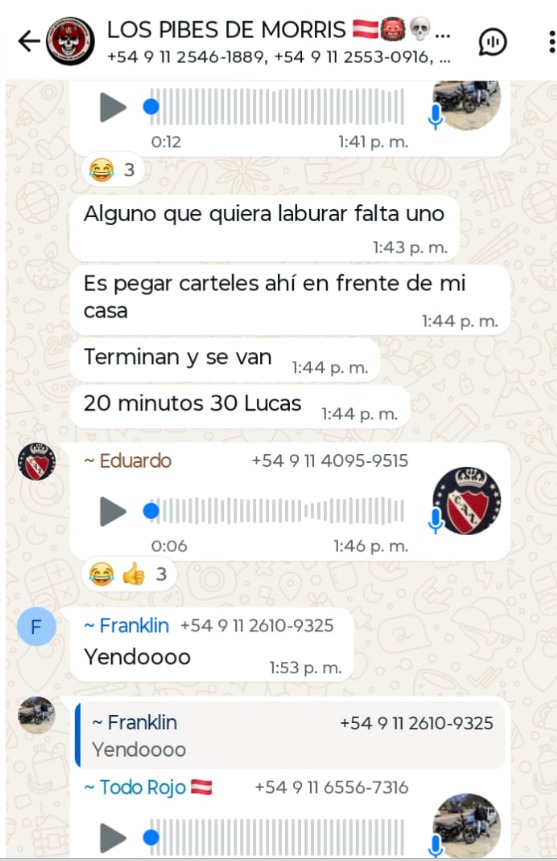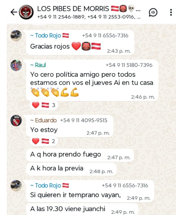 «Este tiró a ese webon por la tribuna«, alardea uno en el chat mostrando la imagen de un barra con la camiseta de Independiente. «Yo se que algunos no les interesa la politica yo soy uno de ellos pero esto es para sacar beneficios para nosotros», quien escribe en los chats filtrados es el cabecilla de la facción de El Rojo incriminada en los terribles hechos de violencia ocurridos el miércoles pasado en el partido entre Independiente y la U de Chile en Avellaneda.