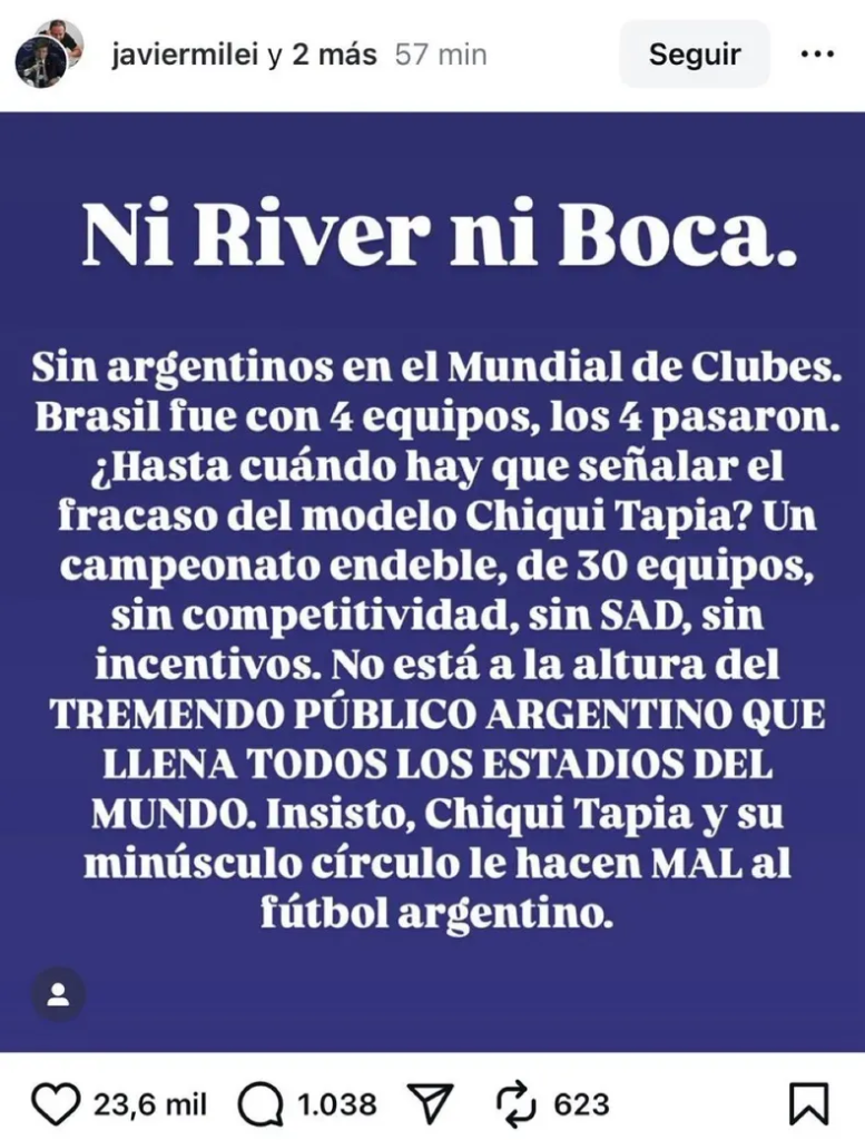 Este post fue difundido por Milei como parte de una campaña para reinstalar con fuerza la discusión sobre la privatización del fútbol argentino, una idea que ya había intentado impulsar sin éxito al inicio de su gestión.